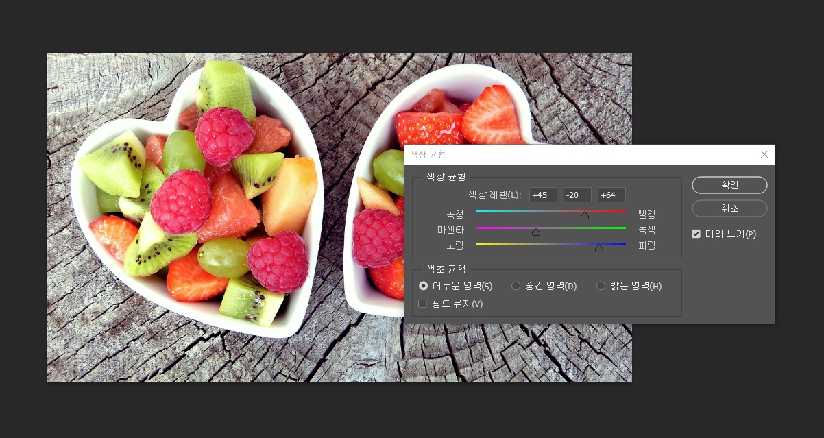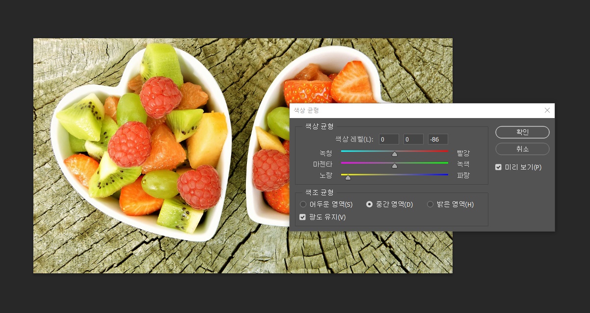 이미지 - 조정 - 색상 균형을 누르시면 됩니다!