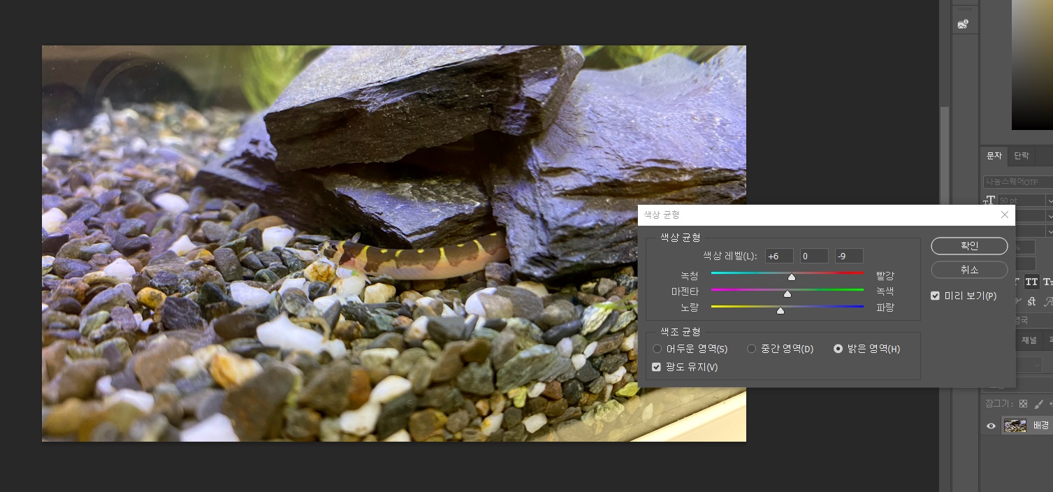 색상 균형 창 아랫쪽에 광도 유지 부분을 체크 해제하면
